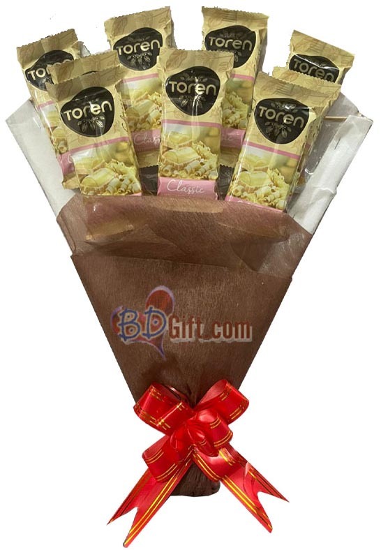 10 pcs toren classic milky chocolate 52gm in a bouquet. Send a delightful gift to Bangladesh! Order a beautiful bouquet of toren classic milky chocolate 52gm, perfect for any occasion. Express your love and joy with this sweet treat. Shop now!